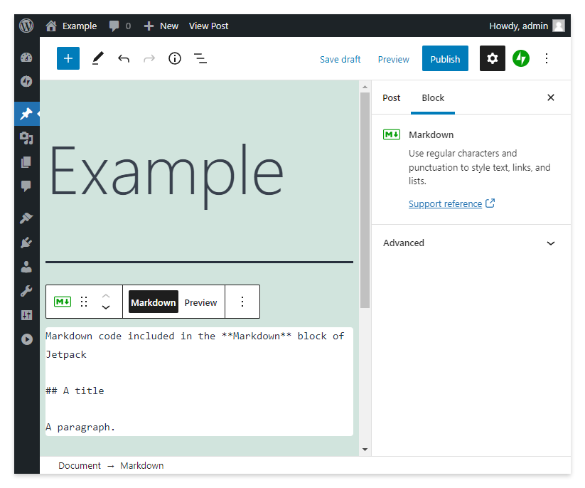 Jetpack aggiunge un blocco chiamato Markdown nel tuo editor WordPress. Per utilizzarlo, selezionalo dal selettore dei blocchi. Ora puoi scrivere in sintassi Markdown e, se lo desideri, visualizzare l’anteprima del risultato HTML nella scheda “Anteprima” del blocco.