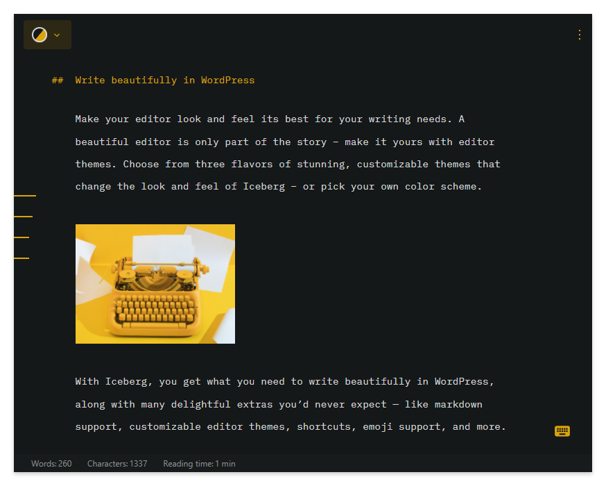 Iceberg è un plugin Markdown elegante e ben sviluppato che trasforma l’editor a blocchi in un editor Markdown dall’aspetto moderno e privo di distrazioni.