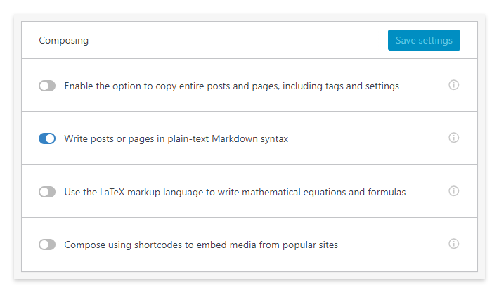 - Attiva l’interruttore “Scrivi articoli o pagine con la sintassi Markdown in testo semplice”.