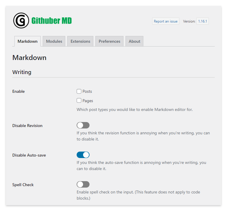 Il plugin WP GitHuber MD è simile a WP Editor.md. Utilizza infatti la stessa libreria Editor.md per portare le funzionalità Markdown nell’editor, e offre un numero comparabile di opzioni di personalizzazione.