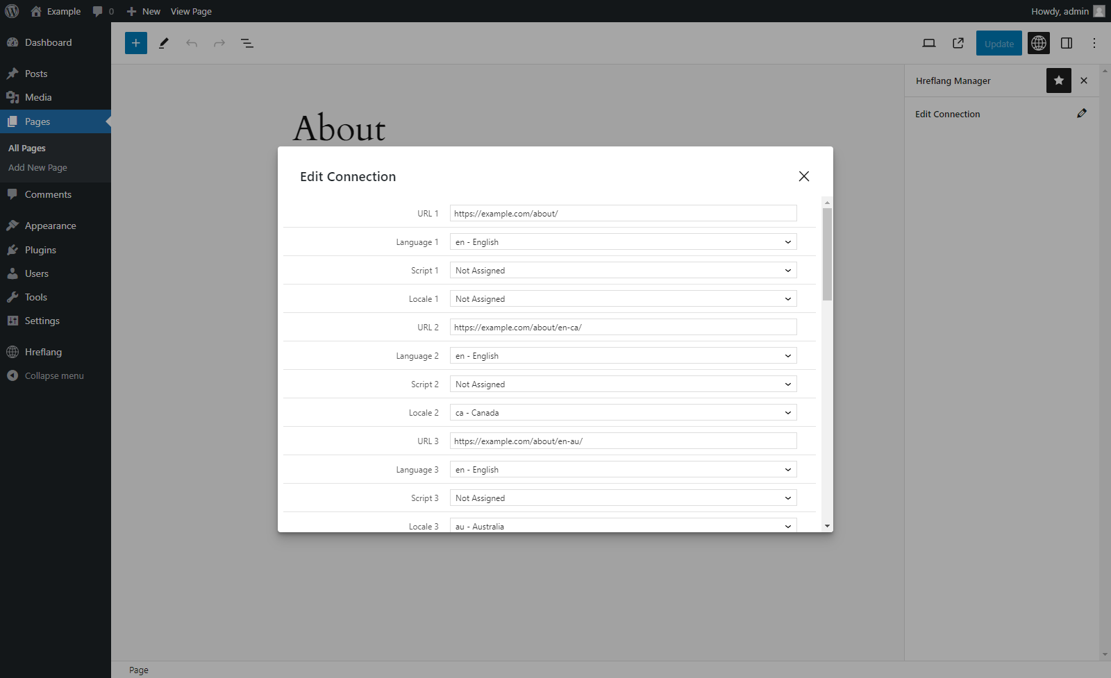 Configura facilmente lingua, variante di scrittura, localizzazione geografica e direttiva x-default delle versioni linguistiche delle tue pagine da un menu dedicato o tramite l'editor degli articoli.