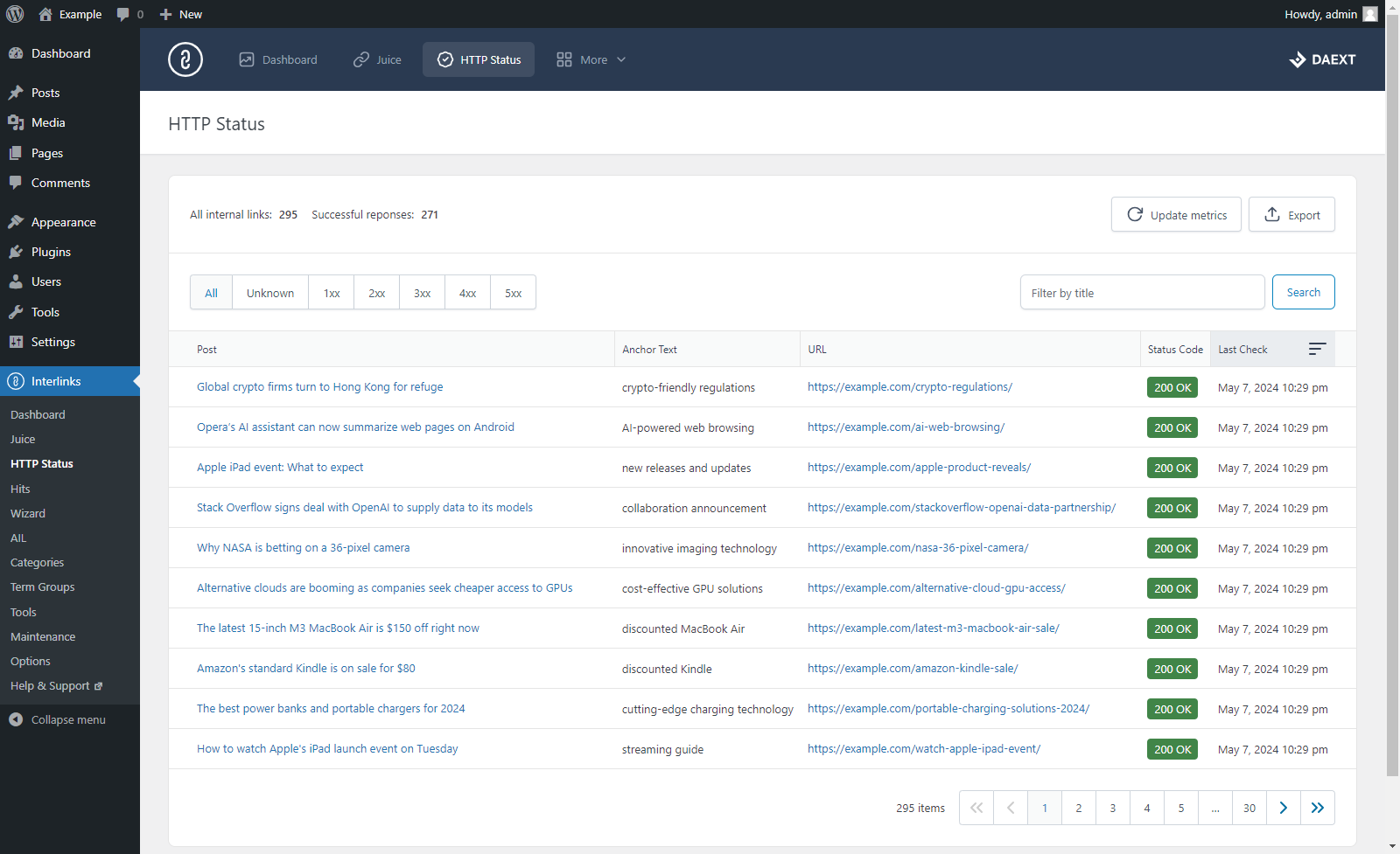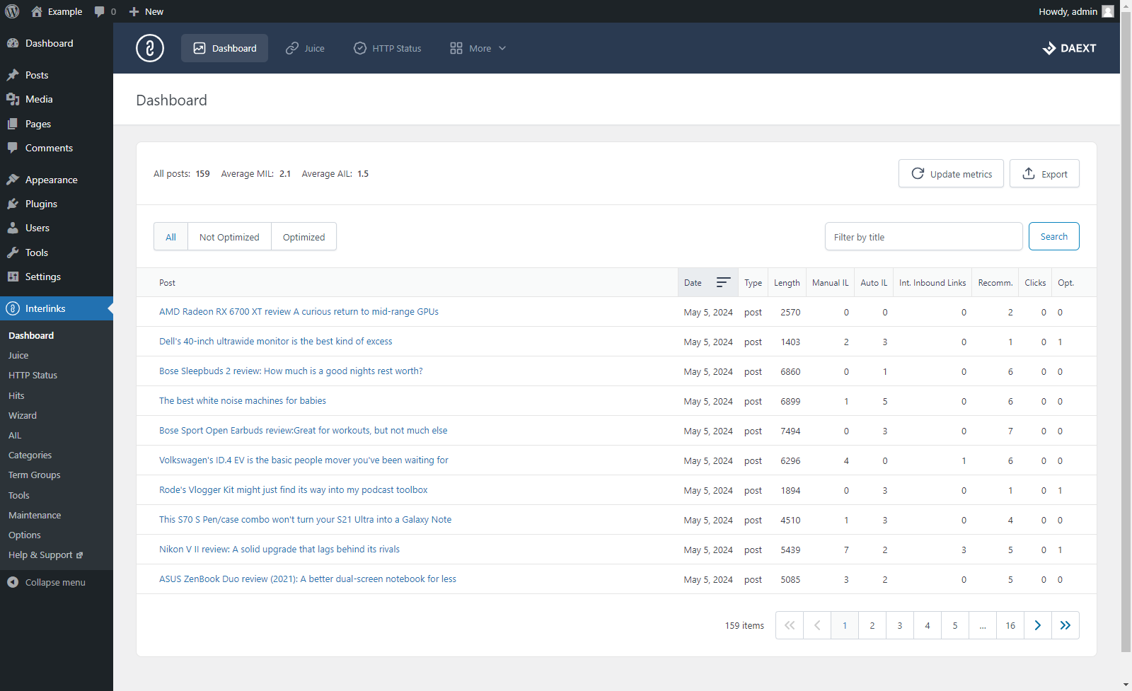 Recupera informazioni come il numero di link interni, il numero di visite generate dai tuoi link interni, lo stato di ottimizzazione dei link interni e altro ancora, grazie a un'analisi avanzata dei tuoi articoli.