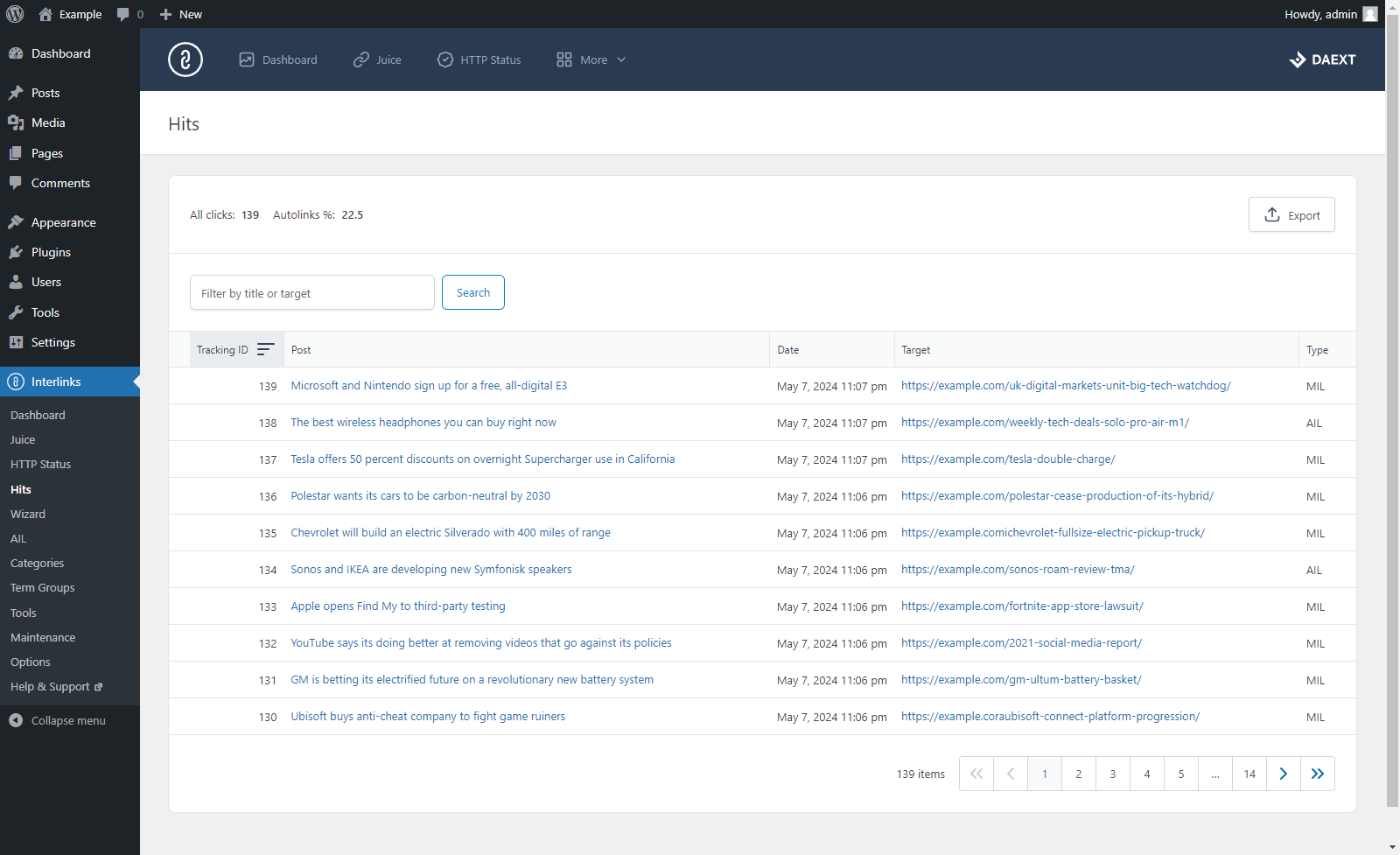 Traccia ogni singolo click effettuato dai tuoi visitatori sui link interni. Saranno disponibili informazioni come l’indirizzo IP dell’utente che ha effettuato il click, la data in cui il link interno è stato cliccato e il riferimento al post che lo contiene.